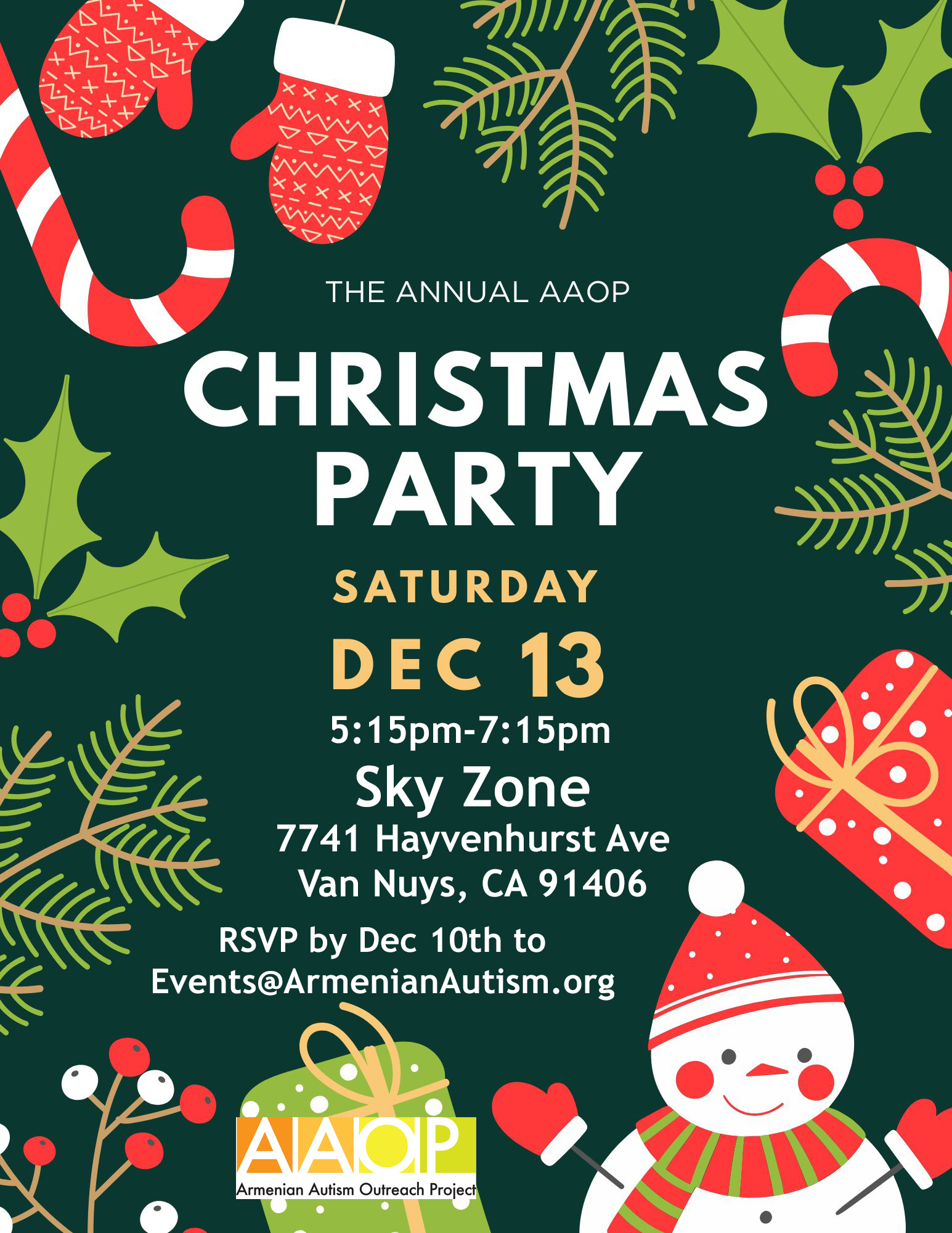 The AAOP Christmas Party is on December 13th, 2025 5:15pm-7:15pm at Sky Zone in Van Nuys, CA. Please RSVP to Events@ArmenianAutism.org
